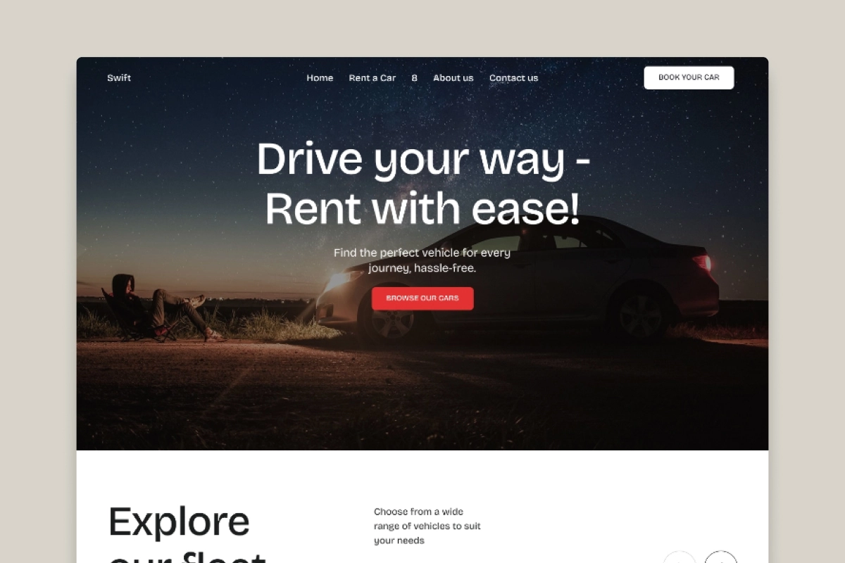 A concept car rental platform designed to showcase speed, clarity, and cohesive visual storytelling.